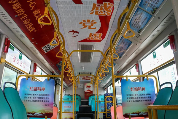 “永遠(yuǎn)跟黨走、同心共乘去追夢(mèng)”公交主題專線選用25路線全線30輛公交車進(jìn)行打造,車身外觀以紅色為主色調(diào),融入建黨100周年圖標(biāo)和“奮斗百年路、啟航新征程”“學(xué)黨史、悟思想、辦實(shí)事、開新局”等宣傳標(biāo)語(yǔ),營(yíng)造出建黨100周年和黨史學(xué)習(xí)的濃厚氛圍。