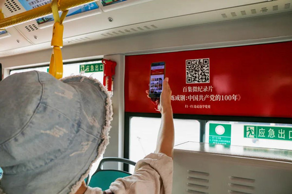 車廂內(nèi)利用前、后門的擋板展示重溫“紅船精神”“井岡山精神”。另外,通過(guò)聯(lián)合南寧云—南寧新聞網(wǎng)利用融媒技術(shù),設(shè)置了“南寧津頭走出的傳奇故事”“我的入黨故事”等紅色主題宣傳板塊,乘客們通過(guò)微信掃描車廂內(nèi)二維碼,可以觀看100部黨史紀(jì)錄故事,可以了解革命先烈雷經(jīng)天的傳奇故事,聆聽南寧市各行業(yè)100名優(yōu)秀黨員的入黨故事,還可以登錄黨史學(xué)習(xí)教育官網(wǎng)關(guān)注黨史教育,進(jìn)行電子閱讀。車廂頂部“感恩黨,跟黨走”的醒目大字,更是讓乘客一上車就感受到濃厚的黨史學(xué)習(xí)氛圍。