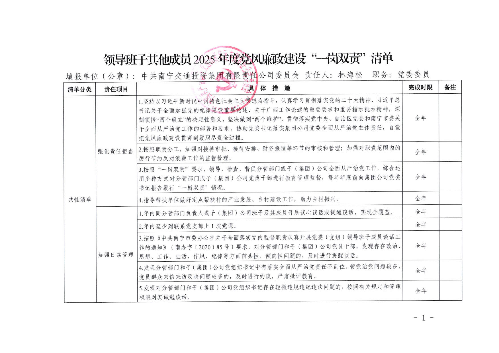 南寧交投集團(tuán)領(lǐng)導(dǎo)班子其他成員2025年度黨風(fēng)廉政建設(shè)“一崗雙責(zé)”清單(三)