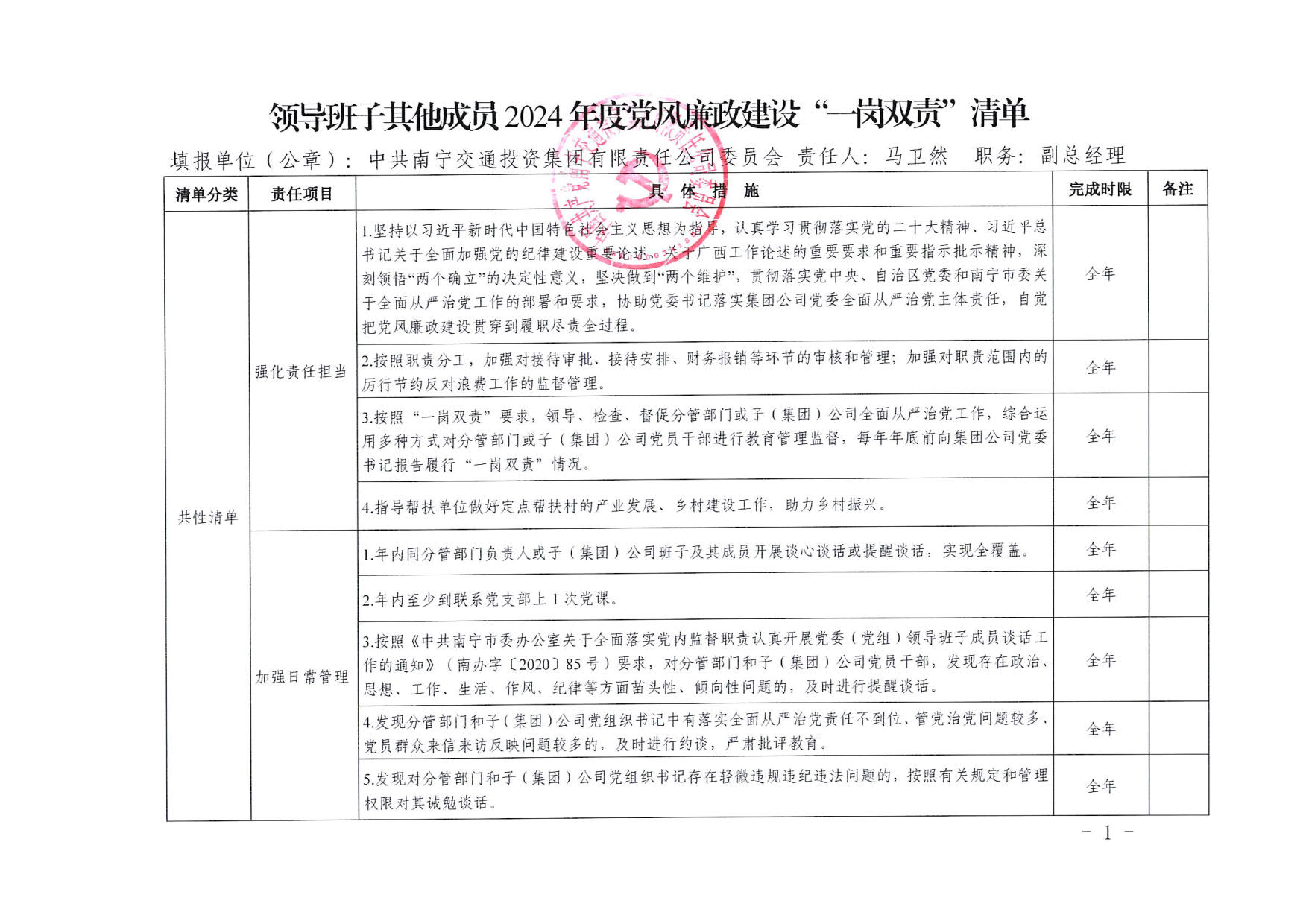 南寧交投集團領導班子其他成員2025年度黨風廉政建設“一崗雙責”清單(五)
